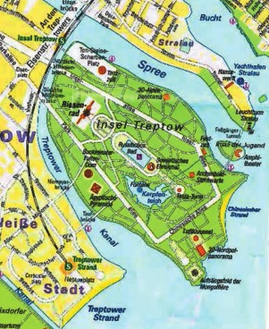 На нем столица Германии представлена в виде портового города и пляжного курорта. Привычная география центра Берлина с реальными названиями улиц осталась практически без изменений, зато «прибрежные» районы полностью преображены. Особенно радикально изменился Трептов-парк: на воображаемый остров Трептов помещены египетская пирамида, китайский пляж и площадь имени легендарной немецкой рок-группы «Ton Steine Scherben». Советский военный мемориал также претерпел трансформацию: под этим названием теперь фигурирует только памятник солдату-освободителю. Та часть мемориала, в которой в реальности расположена статуя скорбящей матери, также сохранила свои контуры, но над ней теперь возвышается колесо обозрения. Между этими двумя точками появился «русский бассейн».