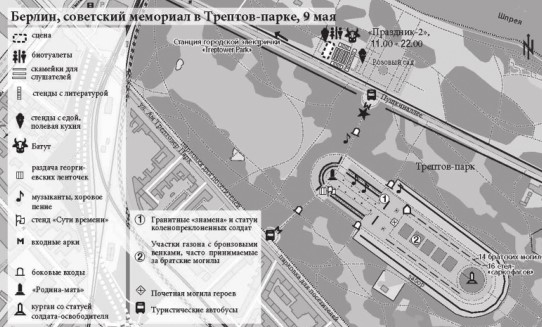 Первый («праздник-1») – собственно мемориальный комплекс, в который подавляющее большинство посетителей попадает через монументальные арки, образующие северный и южный входы[112]. Здесь нет никакой единой праздничной программы, хотя в разных точках западной, наиболее отдаленной от захоронений части комплекса власти разрешают ставить некоторое количество информационных стендов и выступать музыкальным коллективам. Второй полюс («праздник-2») – сцена, стенды с литературой, листовками и едой, столы со скамейками, батут для детей и биотуалеты – расположен на автомобильной стоянке в «Розовом саду». Сад отделен от северной арки мемориала улицей Пушкиналлее и находится ближе к станции электропоездов (S-Bahn) и набережной реки Шпрее с причалом для туристических пароходов. Здесь уже несколько лет 9 мая проводится праздничная программа, организуемая Объединением жертв нацистского режима – Союзом антифашисток и антифашистов (немецкое сокращение – VVN-BdA, в дальнейшем – VVN)[113] и проходящая примерно с 11 часов до позднего вечера.