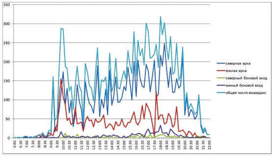 Илл. 4. Посетители, входящие на территорию мемориала 9 мая 2014 г. (за каждый десятиминутный интервал)