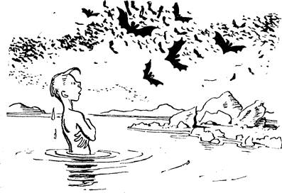 Тем временем солнце скользнуло за горы. Начало темнеть, и в воздухе раздался шум, похожий на хлопанье крыльев. Я поднял голову: одна за другой над нами проносились летучие мыши.