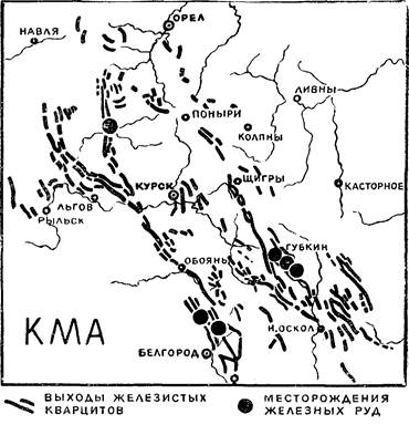 Взглянув на вычерченную мною карту, вы без труда увидите эти горы, но в действительности они находятся на глубине то десятков, то сотен метров и по-прежнему невидимы. В левом нижнем углу карты поставлены три буквы – КМА; та часть Средне-Русской возвышенности, под которой залегают подземные железорудные горы, получила название Курской магнитной аномалии.