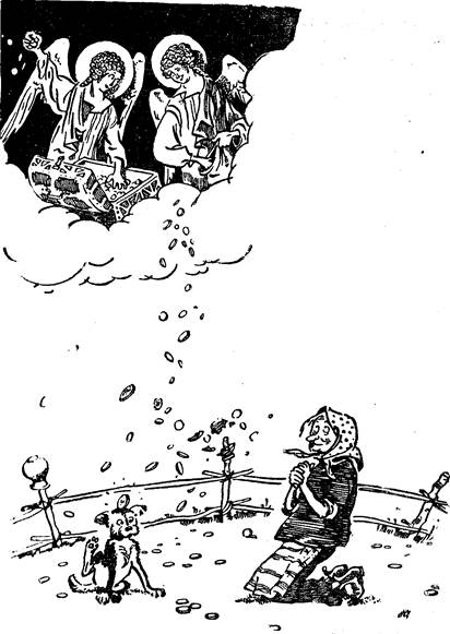 Обрадовалась бабка, собрала деньги в мешок, к соседям кинулась, серебро показывает. Соседи ахают, удивляются, а она им одно твердит: «Вот мне и подал бог. Вам, безбожникам, назло вместе с дождем с неба прислал!» Такую пропаганду божественную развела, что дальше некуда.