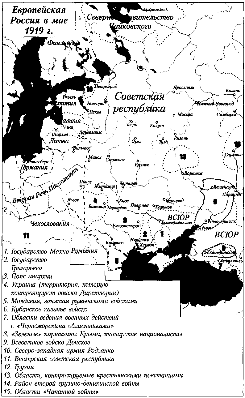 Весной 1919 года вспыхнули восстания казаков в станице Вешенской, немецких колонистов под Одессой, крестьянские восстания в Ливнах, Борисоглебске, Димитрове, под Киевом и Полтавой. Они дожили до прихода белых – повстанцы влились в Белую армию.