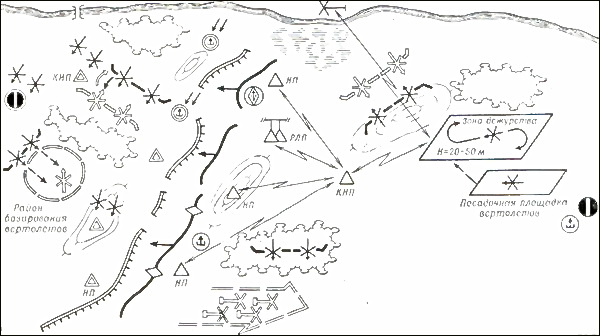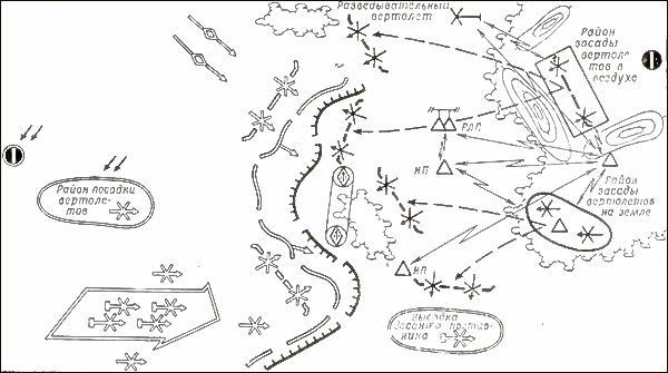 Рис. 25. Уничтожение вертолетов противника действиями своих боевых вертолетов из засад на земле и в воздухе (вариант)