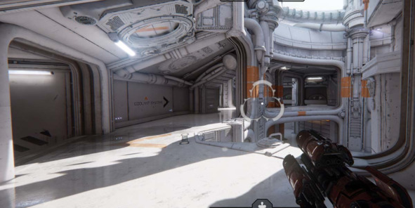 За примером обратимся к уровням из Unreal Tournament 4 (2015, Epic Games), где вся сложная детализация убрана за пределы фокуса сражения. Трубы, решетки и механизмы размещены значительно выше геймплейного пространства.