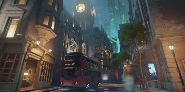 В качестве примера можно привести уровень «King’s Row» из Overwatch (2016, Blizzard). Разработчики решили проблему читаемости персонажей хорошо осветив игровое пространство с помощью многочисленных искусственных источников света (фонари, фары автобуса, рекламные тумбы, подсветка зданий, мягкий свет из окон и т. д.).