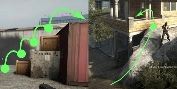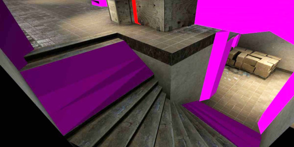 На изображении ниже хорошо видно, как разработчики Counter-Strike: Global Offensive (2012, Valve) используют специальные невидимые поверхности (обозначенные сиреневым цветом), чтобы обеспечить плавность передвижения игрока и исключить любое снижение скорости во время движения.