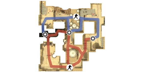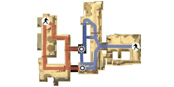 За примером сбалансированной ассиметричной планировки обратимся к Counter-Strike: Global Offensive (2012, Valve). Геймплей уровня «Dust 2» строится на прорыве трех ключевых точек, которые ведут к местам закладки бомбы. Первая точка столкновения размещена в тоннеле слева (время в пути – 12 секунд), вторая – прямо по центру около ворот (6 секунд), а третья – справа за воротами, перед выходом на длинную улицу (10 секунд). В свою очередь, места закладки бомбы находятся относительно недалеко друг от друга, что дает возможность спецназу вовремя добраться до точки и успеть предотвратить взрыв.
