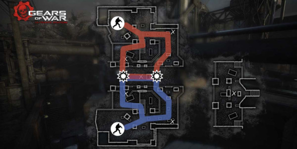 Еще один пример «Восьмерки» с двумя точками столкновения можно подсмотреть на уровне «Tyro Station» из Gears of War (2006, Epic Games). Здесь противоборствующие команды встречают друг друга либо в тоннеле под железнодорожными путями, либо на станции сверху. В случае, если вся команда противника сосредоточена только на одной точке рандеву, перемычка между местами пересечения двух кругов открывает возможность атаки с фланга, либо позволяет избежать столкновения.
