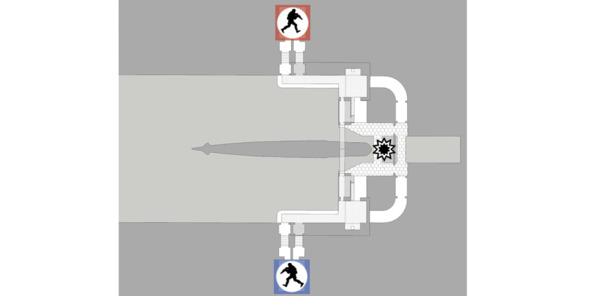 Зеркальная планировка – это самый простой способ сбалансировать мультиплеерный уровень с фиксированными точками появления игроков. Планировка такого типа делит уровень на две симметричные части, что обеспечивает равные стартовые условия и предсказуемые точки столкновения игроков. Предсказуемость гарантируется тем, что обе стартующие одновременно команды пробегают одинаковое расстояние до первого боестолкновения.