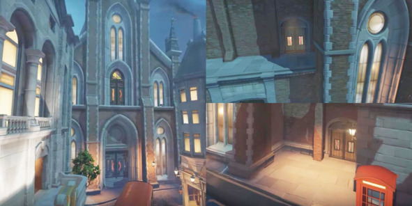 На уровне «King’s Row» из Overwatch (2016, Blizzard) местом появления атакующей команды выбрана просторная церковь. На поле боя из неё можно попасть через четыре двери, которые расположены не только в противоположных частях здания, но и на разных этажах.