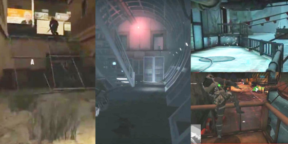 Так, например, на уровне «Sub-Pen» из Tom Clancy’s Ghost Recon Phantoms (2012, Ubisoft) баланс достигается за счет симметричного расположения путей и укрытий, а также размещением контрольной точки в самом центре уровня. Схема включает в себя три основных пути – навесной мост над подводной лодкой (с которого можно легко контролировать точку захвата по центру), центральный выход на платформу и тоннель (дающий возможность зайти в центр незамеченным, либо попасть сразу в тыл противника).