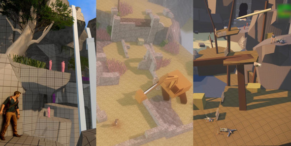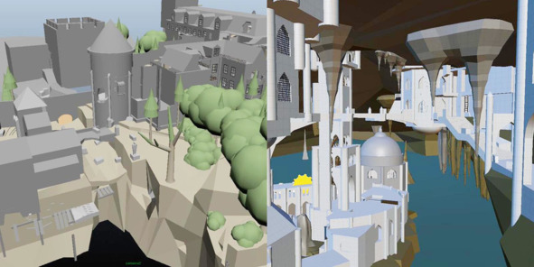 Еще любопытные примеры играбельного прототипа – это уровни «The Chateau» и «The Atlantis of the Sands» из Uncharted 3: Drake’s Deception (2011, Naughty Dog). Как видно на изображении ниже, дизайнерам уровней необязательно быть виртуозным 3D-художником. Умения сборки трехмерной болванки из примитивов вполне достаточно.