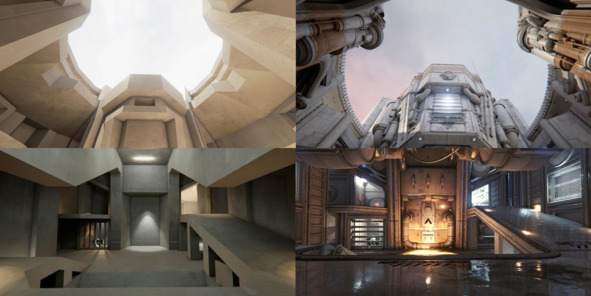 Например, по рабочим скриншотам арены «Outpost 23» из Unreal Tournament (2015, Epic Games) видно, насколько быстро можно вносить изменения в планировку локации, если её геометрия использует примитивные формы (рис. 1 и 2). А теперь представьте сколько времени потребовалось бы художникам и дизайнерам, чтобы изменить планировку финальной версии уровня, которая содержит в себе множество мелких деталей (рис. 3 и 4).