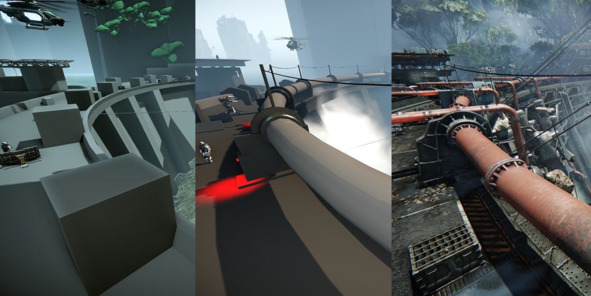 Шаг второй – сборка уровня из временных моделей на основе геймплейного прототипа. Основное правило – художник по окружению должен постараться не только оставить геймплей прототипа неизменным, но также использовать любые художественные средства для улучшения навигации по уровню (освещение, композиция, контраст и т. д.).