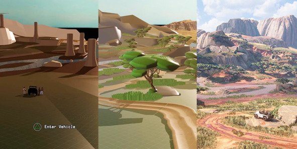 Еще один интересный пример можно подсмотреть в Uncharted 4: A Thief’s End (2016, Naughty Dog). На изображении ниже представлена локация из эпизода «The Twelve Towers», которая наглядно демонстрирует различие в уровне на разных этапах разработки.