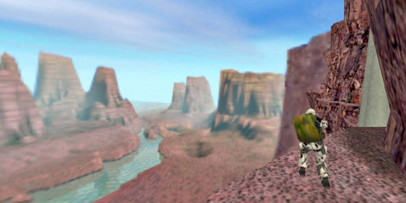 Вместе с развитием технологий и увеличением детализации свой путь эволюции прошел и задний план. Изначально он представлял собой фотопанораму либо трехмерную визуализацию, где все детали были частью статичного двухмерного изображения. Например, вот так в Half-Life (1998, Valve) выглядит статичная панорама каньона: