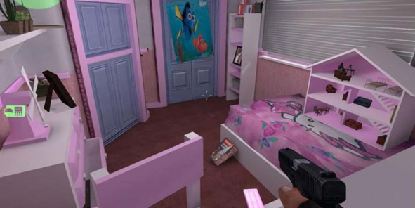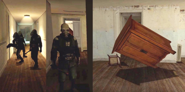 Похожий прием использовали в Half-Life 2 (2004, Valve). Исследуя многоквартирный дом, главный герой становится свидетелем того, как группа полицейских вламывается в квартиру одного из жителей (рис. 1.). Не имея возможности попасть внутрь, игрок слышит звуки борьбы и видит, как в комнате кто-то опрокидывает шкаф (рис. 2.).