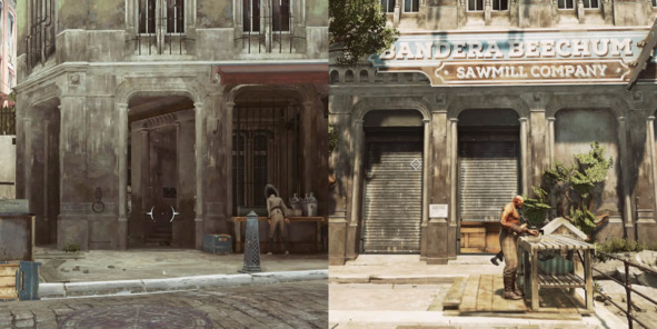 В Dishonored 2 (2016, Arkane Studios) модульная система очень органично вписывается в мир игры, поэтому переиспользования геометрии уровней практически не замечаешь. Например, элементы фасада с проемами отлично подходят как для глухих стен, дверей и окон, так и для создания пешеходных галерей.