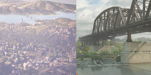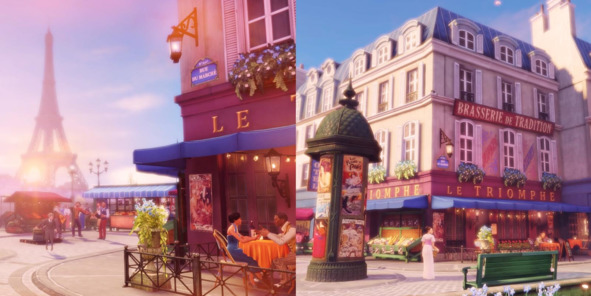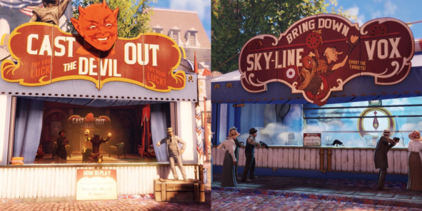 Для того, чтобы сделать локацию похожей на настоящий Париж, разработчики BioShock Infinite (2013, Irrational Games) не стали воссоздавать его точную копию, а сфокусировали всё внимание на атмосферности и узнаваемых деталях. Благодаря Эйфелевой башне на горизонте, иконической набережной Сены и архитектурным деталям (форма крыш и окон, вывески на французском) у игрока создается впечатление, что он исследует именно Париж.