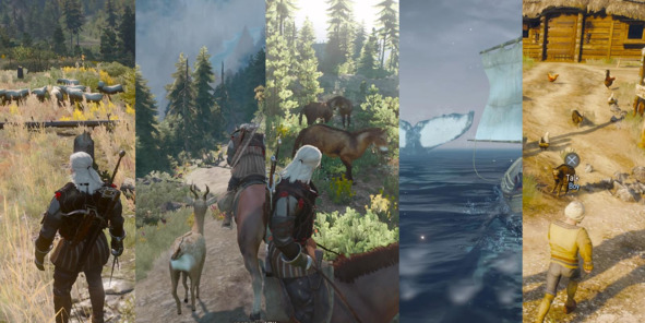 В The Witcher 3: Wild Hunt (2015, CD Projekt RED) можно встретить множество диких и домашних животных. В океане время от времени на поверхность всплывают гигантские киты. Еще одна забавная деталь – все кошки в игре очень бурно реагируют на кошачьи зрачки главного героя, шарахаются и в ужасе начинают шипеть.