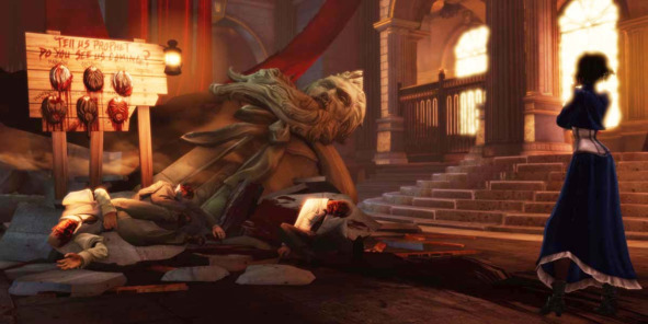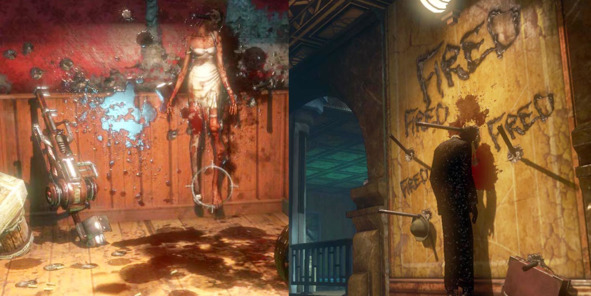 В BioShock Infinite (2013, Irrational Games) мы играем роль наемника, которому поручили найти девушку. О серьезности намерений заказчика главному герою дают понять при помощи многочисленных угроз, которыми напичкано окружение. В самом начале игры, поднимаясь на вершину маяка, игрок находит тело человека со следами пыток и табличкой «Не разочаруй нас!».