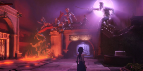 И снова за примером обратимся к BioShock Infinite (2013, Irrational Games). Благодаря многочисленным фрескам, плакатам, торжественным надписям на статуях и зданиях, можно узнать об устройстве жизни в летающем городе Колумбии и о царящих там порядках.