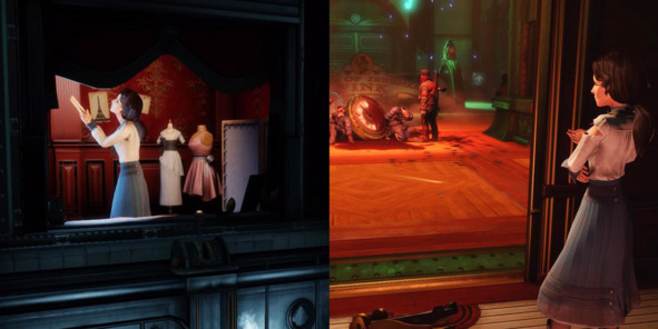 Так, в BioShock Infinite (2013, Irrational Games) главный герой впервые видит Элизабет через окно, спрятанное за прозрачным зеркалом. В большинстве случаев сюжетные сценки ждут нас на выходе из лифта или сразу за дверным проемом.