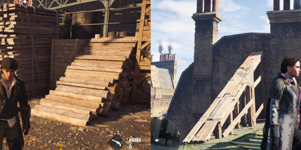 В Assassin’s Creed Syndicate (2015, Ubisoft) практически на каждом шагу можно встретить большое количество объектов, образующих направляющие линии. Например, перемахнуть через забор на полном ходу можно, забежав на него по импровизированному трамплину.