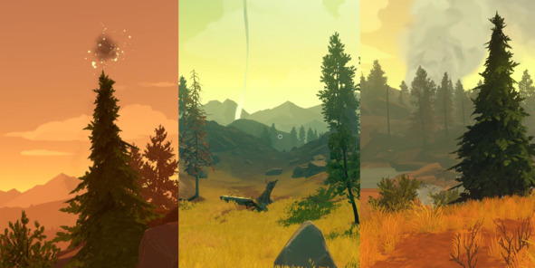 Для того, чтобы вести игрока к важной сюжетной точке, разработчики Firewatch (2016, Campo Santo) используют события, последствия которых видны издалека (фейерверк, дым от костра или контролируемого сжигания леса).