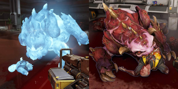 Так, например, наткнувшись на запертую дверь, игрок видит видение, в котором демон убивает охранника и тащит его тело за собой. Если проследовать за «призраком» монстра, то можно найти тело бедолаги, которое поможет нам пройти сканер сетчатки.