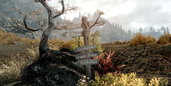 На дорогах в The Elder Scrolls V: Skyrim (2011, Bethesda Game Studios) можно обнаружить множество дорожных указателей с названиями населенных пунктов. Их расположение и назначение не вызывает вопросов у игрока, так как они воспринимаются как естественная часть игрового окружения.