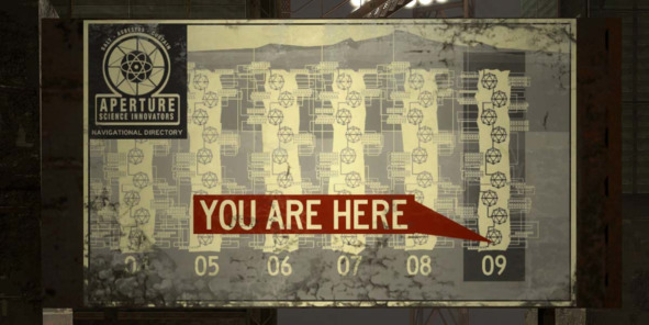 Например, в Portal 2 (2011, Valve) мы исследуем гигантскую подземную лабораторию с множеством тестовых помещений, в которых проводятся испытания портальной пушки. Благодаря многочисленным плакатам и картам-схемам мы можем не только определить своё положение в пространстве, но и наглядно оценить масштабы подземного комплекса, ознакомившись с его подробным планом.
