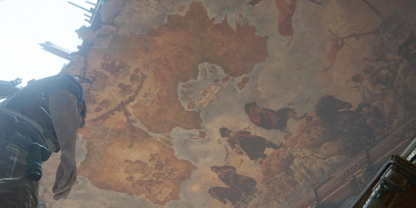 Еще один любопытный пример можно подсмотреть в Uncharted 4: A Thief’s End (2016, Naughty Dog) – это гигантская фреска на потолке с картой затерянного острова. На ней показаны основные локации, которые главный герой еще не посетил. Такой прием позволяет задействовать воображение игрока, чтобы мотивировать его на дальнейшее исследование острова.