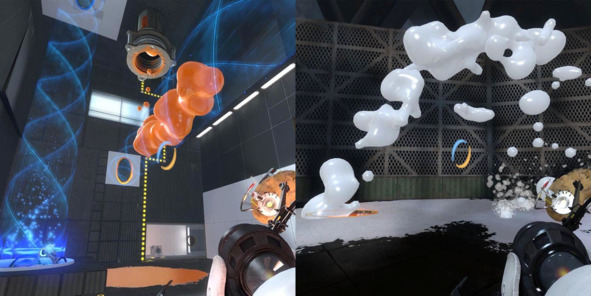 В основе геймплея Portal 2 (2011, Valve) лежит одно простое правило – создавать два связанных портала при помощи портальной пушки можно только на поверхностях белого цвета. Такой незатейливый визуальный язык позволил разработчикам подойти к дизайну головоломок с совершенно неожиданной стороны. В одной из тестовых лабораторий игрок может направлять струю краски и окрашивать стены в белый цвет, тем самым создавая новые поверхности для применения портальной пушки.