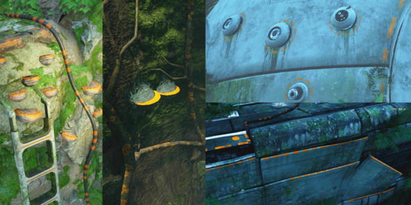 Если посмотреть на изображение ниже, то становится совершенно неочевидно какой из этих уступов интерактивен? А как объяснить игроку то, что он может лазать по зеленой растительности?