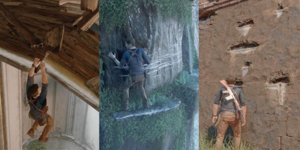 Разработчики Uncharted 4: A Thief’s End (2016, Naughty Dog) обозначают интерактивные уступы белым цветом. Стены, вдоль которых главный герой может медленно ходить по узкому карнизу, помечают длинными горизонтальными царапинами.