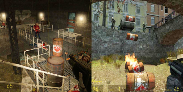 Взрывоопасные бочки из Half-Life 2 (2004, Valve) не только окрашены в красный цвет, но и снабжены эмблемой «Воспламеняющееся вещество». Такой визуальный язык позволяет максимально точно характеризовать геймплейную функцию – перед тем как взорваться, бочка вспыхивает пламенем на несколько секунд.