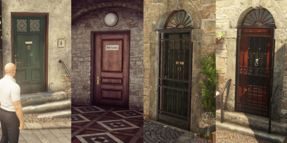 Похожий визуальный язык помогает определить статус дверей. Разработчики Hitman (2016, IO Interactive) оснащают заблокированные двери специальными решетками. Таким образом, отличить статичную дверь от интерактивной не составляет труда.