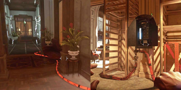 Электрические барьеры из Dishonored 2 (2016, Arkane Studios) можно отключить только при помощи специальной панели управления, которая обычно находится где-то по соседству. Для того, чтобы сделать взаимосвязь этих объектов очевидной, их соединяют ярко-оранжевым кабелем.