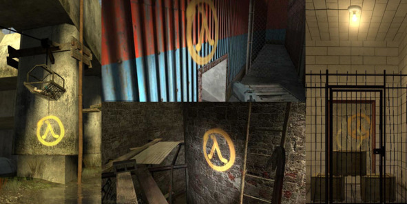 В Half-Life 2 (2004, Valve) такой подсказкой для обозначения секретных мест стало граффити с «лямбдой» – буквой греческого алфавита.