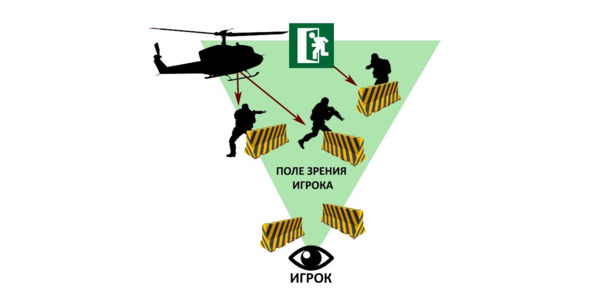 Рассмотрим схему, на которой обозначены типичные ошибки, ведущие к слабо выраженному фокусу сражения. Во-первых, места появления врагов находятся вне поля зрения игрока. Во-вторых, укрытия с врагами разбросаны слишком далеко друг от друга, что приведет к одновременному огню со всех направлений. В-третьих, выход с поля боя размещен за кадром и игрок просто не будет знать куда ему двигаться дальше.