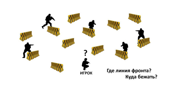 Отсутствие четко выраженной линии фронта ведет к неконтролируемому хаосу на поле боя и рождает множество вопросов. Рассмотрим схему ниже. Во-первых, где здесь проходит линия фронта? Во-вторых, с какой стороны следует ожидать нападения противника? В-третьих, где находится фокус сражения? В-четвертых, куда игроку двигаться дальше?