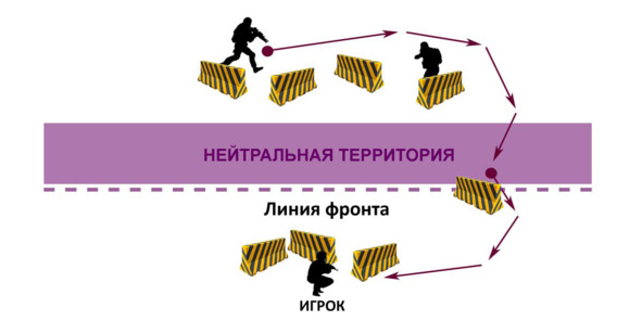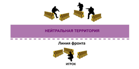 Нейтральная территория (в англ. – «no man’s land») – это открытое и опасное место не дающее никаких преимуществ. Нахождение в нейтральной зоне должно быть настолько невыгодно и опасно, что заставит игроков сохранять свои позиции в укрытиях, по разные стороны линии фронта.