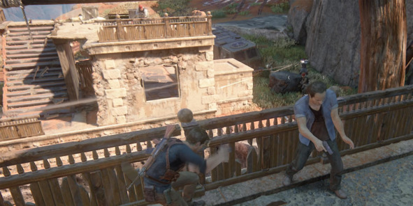 В эпизоде с обороной ворот на уровне с Мадагаскаром из Uncharted 4: A Thief’s End (2016, Naughty Dog) использована похожая структура поля боя с двумя зданиями и пропастью между ними.