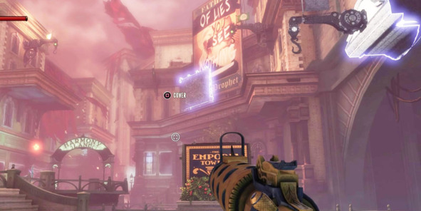 В BioShock Infinite (2013, Irrational Games) главные герои попадают на площадь, которая простреливается снайперами с крыши дома напротив.