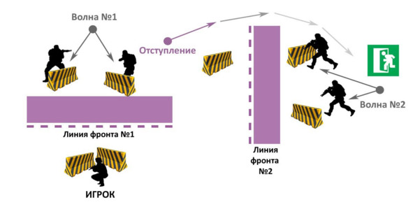 После успешного поединка на линии фронта «номер один» необходимо тут же переместить фокус сражения на линию фронта «номер два». Для этого остатки сил противника при помощи импровизированного отступления перебрасываются на новые позиции, куда тут же прибывает подкрепление.
