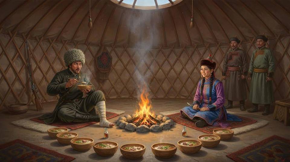 Охотник, отправленный на «задание» первым, наконец-то принёс лохань с бараньими ребрами. Я слил немного воды, чтобы помыть руки. Потом ещё чуть-чуть залил в лохань. Хорошо промыл рёбра, снял с пояса кривой бурятский нож-хутагу. Резала хутага хорошо, и рёбра легко отделялись одно от другого. Покончив с этим, я сложил их в котёл и залил водой. Достал из поясной сумки маленький кулёк с солью и бросил несколько щепоток. Только после этого, я поставил котел на решетку очага. Прямо в кизяк никто посуду не ставит, его всегда что-то отделяет от котлов и казанов.