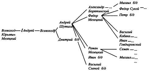 Наконец, одним из важнейших факторов, определявших положение Мезецких, был усилившийся во второй половине XV в. процесс раздробления родовой вотчины: в поколении, действовавшем в конце столетия, насчитывалось семеро князей Мезецких (потомки Федора и Романа Андреевичей – см. выше схему 4), что, естественно, сказывалось на размерах «дольниц» каждого из них, а результатом была ожесточенная вражда среди княжеской «братии», в частности, между Федоровичами и Романовичами Мезецкими, попавшая на страницы посольской книги 90-х гг. XV в. [226]226
