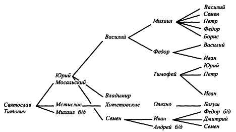 [Закрыть]. Зато продолжали существовать ветви Мосальских и Хотетовских (к концу столетия совершенно измельчавшие) – потомков внука Мстислава Карачевского, Святослава Титовича (схема 5).